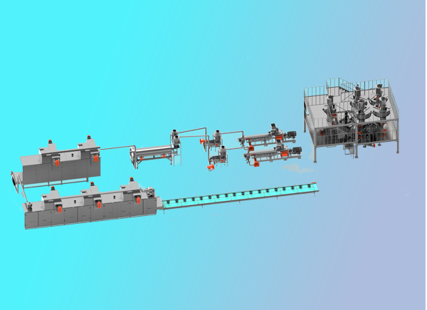 粉碎機→ 攪拌機→ 飼養(yǎng)員→ 擠出機→ 振動篩→ 鼓風機→ 多層烤箱→ 冷卻輸送機→ 包裝機