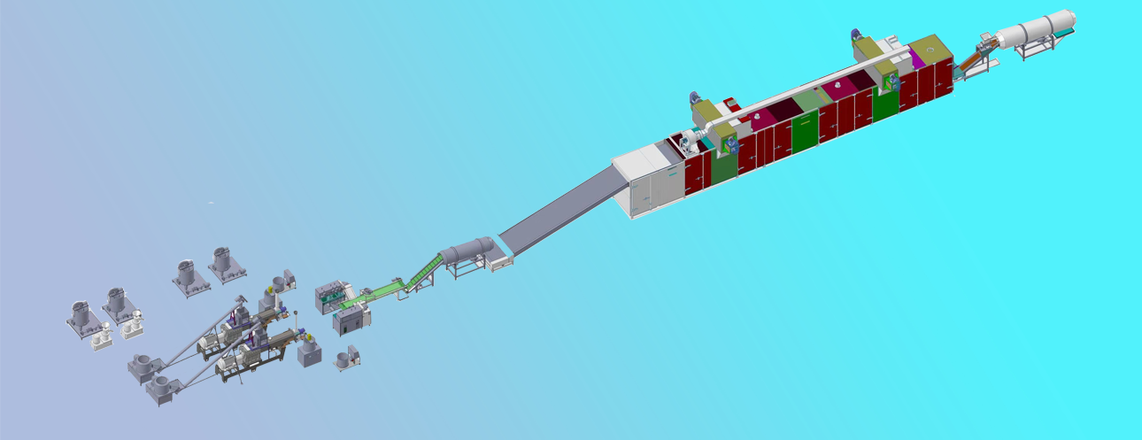 拌粉機→螺旋上料機→雙螺桿膨化機→夾心機-整形切斷機→提升機→六米五層烘干機-雙筒調味機